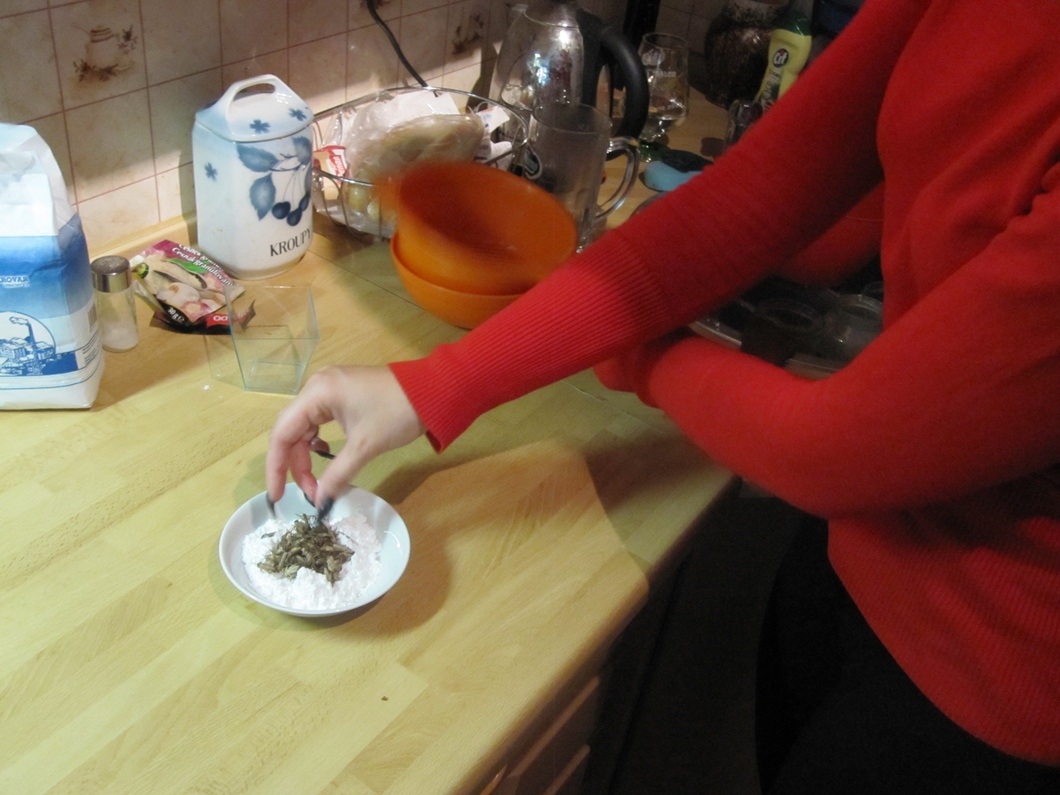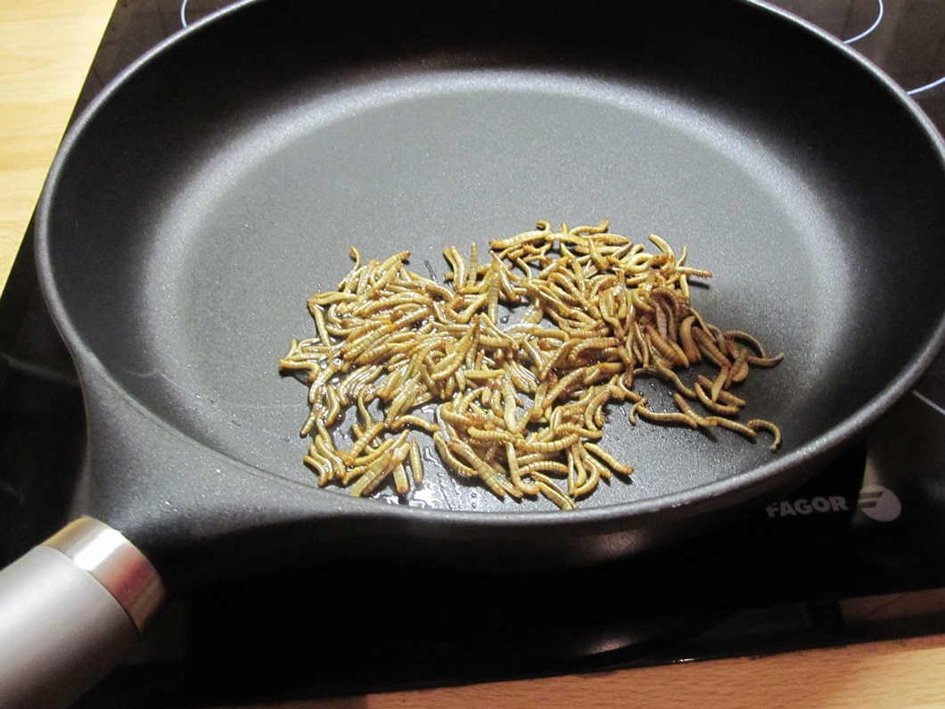 „Larvy potemníka moučného neboli mouční červi,“ představuje mi zooložka Erika Prokešová mou dnešní večeři. Přiznávám, že klubko hemžících se červů mě zrovna k nadšení nepřivádí. „Tohle už jsou docela vzrostlé larvy, v nějakém třetím až čtvrtém instaru, za chvilku by se zakuklily a byli by z nich dospělí brouci potemníci,“ říká Erika, zatímco vaří vodu, kterou červy zabije. „Je to otázka vteřiny, dvou. Je to jednak nejrychlejší a nejhumánnější smrt – a taky zaručená, takže nám pak nikam neodlezou nebo neodskáčou, a jednak mám vyzkoušeno, že když se dají na pánev živí, hrozně prskají. To dobré z nich vystřelí a zůstane jen kůžička.“