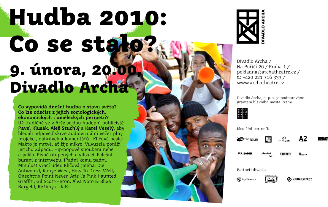 Za rokem 2010 se zavřela voda, leckdo bilancuje, co například v hudbě dal a vzal. V pražském Divadle Archa se 9. února už poněkolikáté sejde silná trojka renomovaných hudebních publicistů, aby jednak zmapovali nejdůležitější hudební dění za uplynulý rok, jednak aby se ho pokusili vsadit do širšího kontextu.