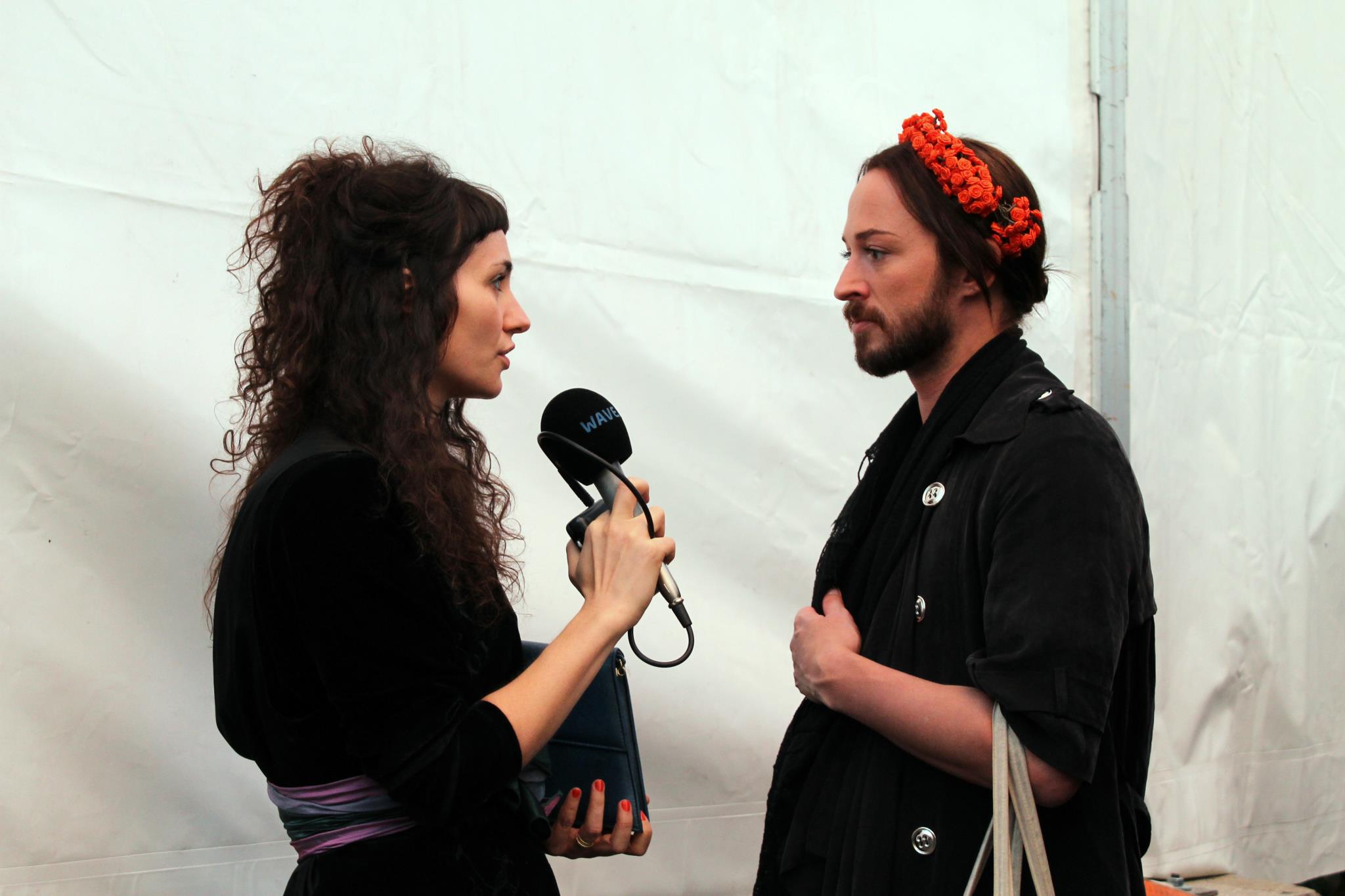 Přehlídku si s okouzlující grácií sám otevřel a uzavřel: na vysokých podpatcích, s pěstěným plnovousem a květinovým věnečkem ve vlasech. K rozhovoru jsme se setkali hned po přehlídce, podlezli jsme plachtu v backstage fashion stanu a vyhlíželi na krásné panorama Prahy z Hradčanského náměstí.