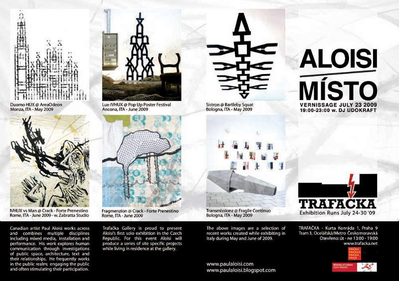 První českou výstavu kanadského streetartového umělce Paula Aloisiho je možnost do 30. července vidět v galerii Trafačka. Jeho práce kombinující rozličné styly a techniky. Ve své práci vytváří nové výrazové prostředky ve veřejném prostoru, architektuře, textu a v jejich vztazích.
