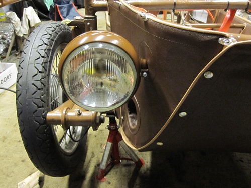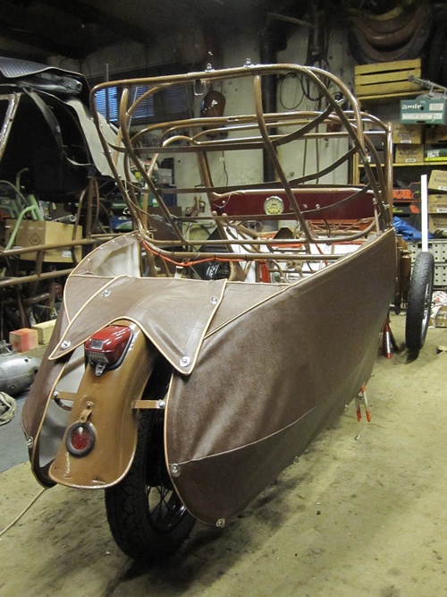 Po experimentech s duralovým plechem nebo montérkovým plátnem pak Mojmír Stránský jaksi „pod rukou“ přišel k balíku koženky pro vlakové sedačky. Umělá textilní kůže, která dala tříkolce řadu přezdívek, už jí zůstala.