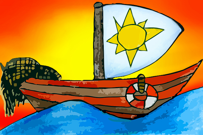 Na loďce se houpají rozdovádění kamarádi vodníci. Barel s vodou je už úplně prázdný.